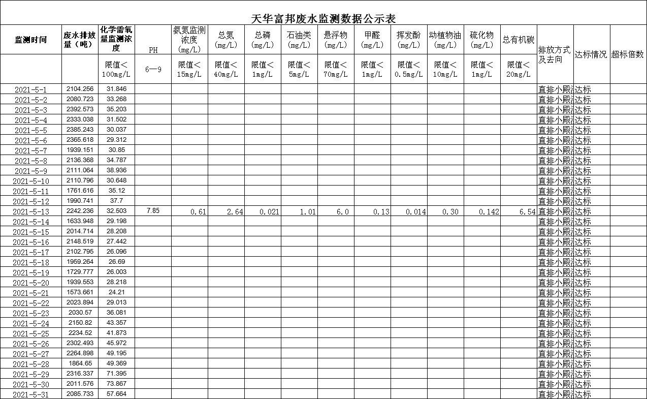 四川天華富邦化工有限責任公司5月廢水監(jiān)測數(shù)據公示
