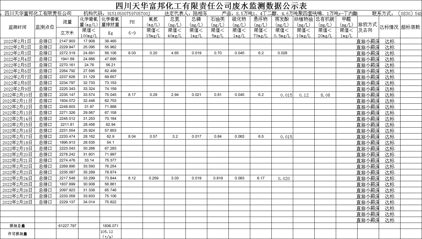 四川天華富邦化工有限責(zé)任公司2022年2月廢水監(jiān)測數(shù)據(jù)公示
