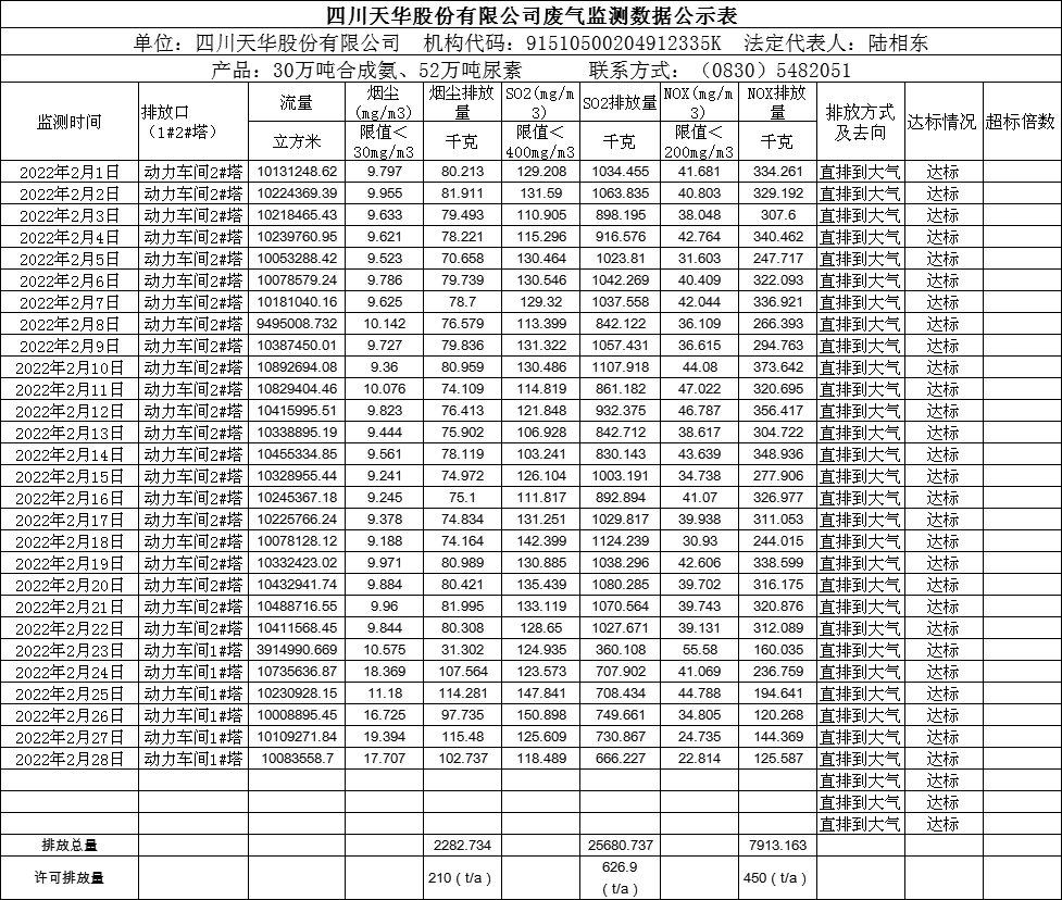 四川天華股份有限公司2022年2月廢氣監測公示