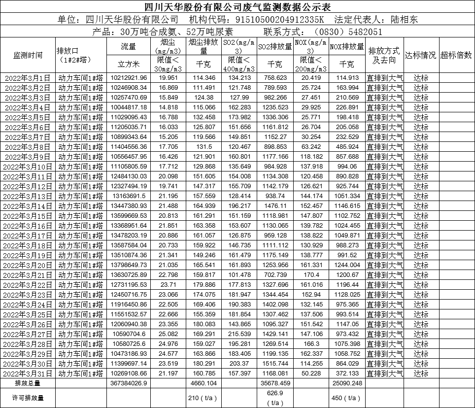 四川天華股份有限公司2022年3月廢氣監(jiān)測(cè)公示