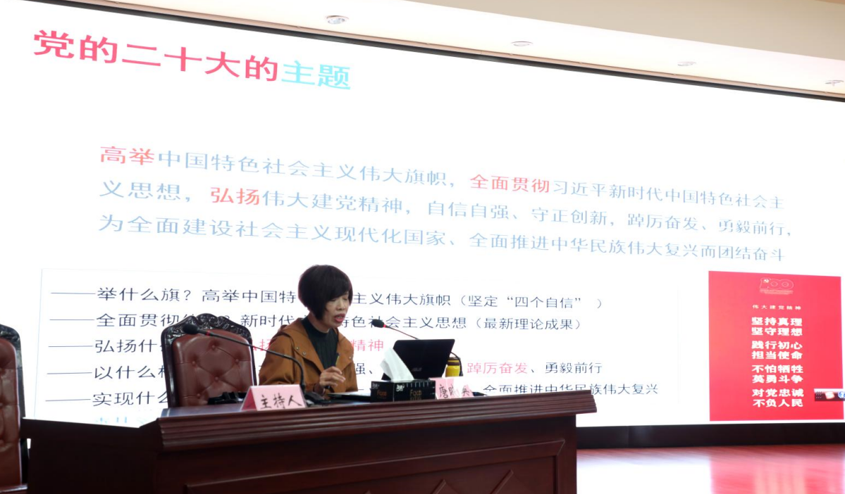 唐曉英從深刻把握黨的二十大的主題和主要成果、深刻把握過去5年的工作和新時代10年的偉大變革、深刻把握開辟馬克思主義中國化時代化新境界的歷史責任、深刻把握以中國式現(xiàn)代化全面推進中華民族偉大復興的使命任務、深刻把握全面建設社會主義現(xiàn)代化國家的目標任務、深刻把握加強黨的全面領導和全面從嚴治黨的部署要求、深刻把握應對風險挑戰(zhàn)的重要要求、堅定推動黨的二十大決策部署在四川落地生根等方面,對黨的二十大精神進行了系統(tǒng)宣講和詳細闡述。