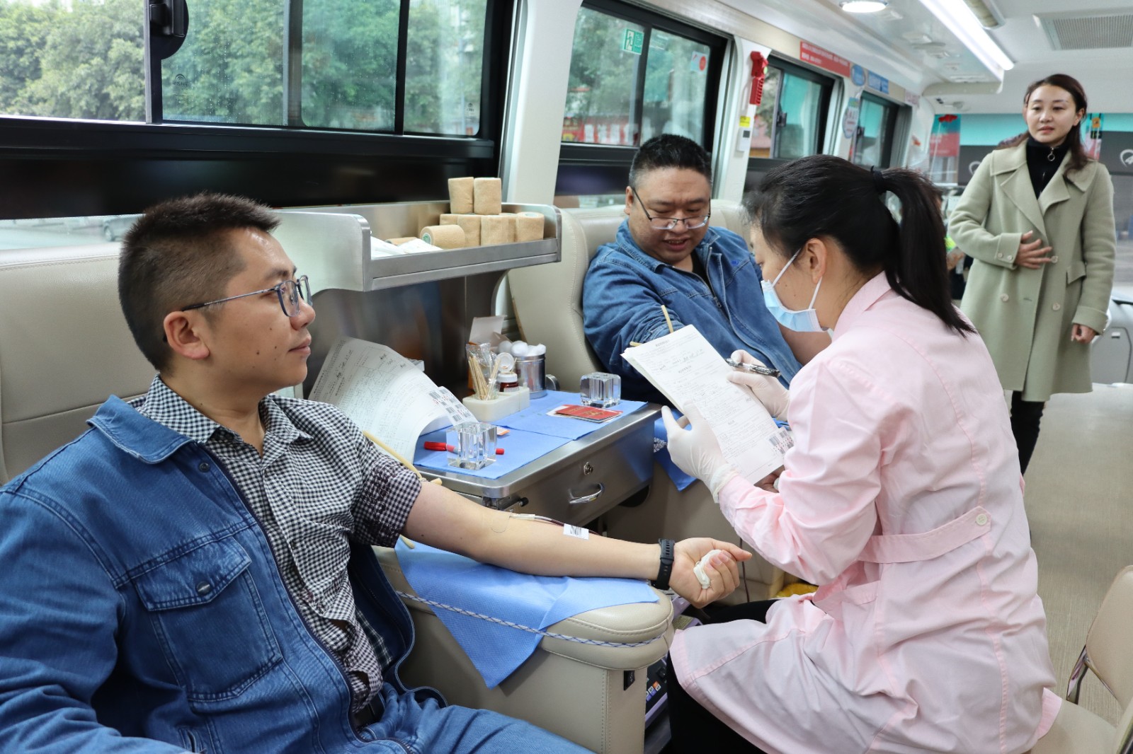 陽春三月,天氣雖然還有些寒冷,但春寒沒能阻擋天華人獻(xiàn)血的熱情。在醫(yī)務(wù)人員的引導(dǎo)下,來自集團(tuán)職能部門和生產(chǎn)車間的職工列隊(duì)接受中心血站安排的獻(xiàn)血準(zhǔn)備工作。參與獻(xiàn)血的志愿者有集團(tuán)高層領(lǐng)導(dǎo),也有中層管理人員和一線職工。大家認(rèn)真填寫獻(xiàn)血登記表、測(cè)量血壓、配合抽血化驗(yàn)等,在確定符合獻(xiàn)血條件后依次登上采血車接受采血。