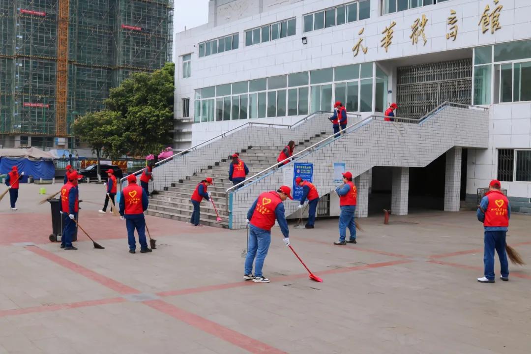 活動現場,志愿者們身著統一服裝、佩戴手套,手持清掃工具在體育館大門集合就緒,隨后分工協作、迅速行動,全力投入到體育館內部及周邊公共區域的清掃工作中。